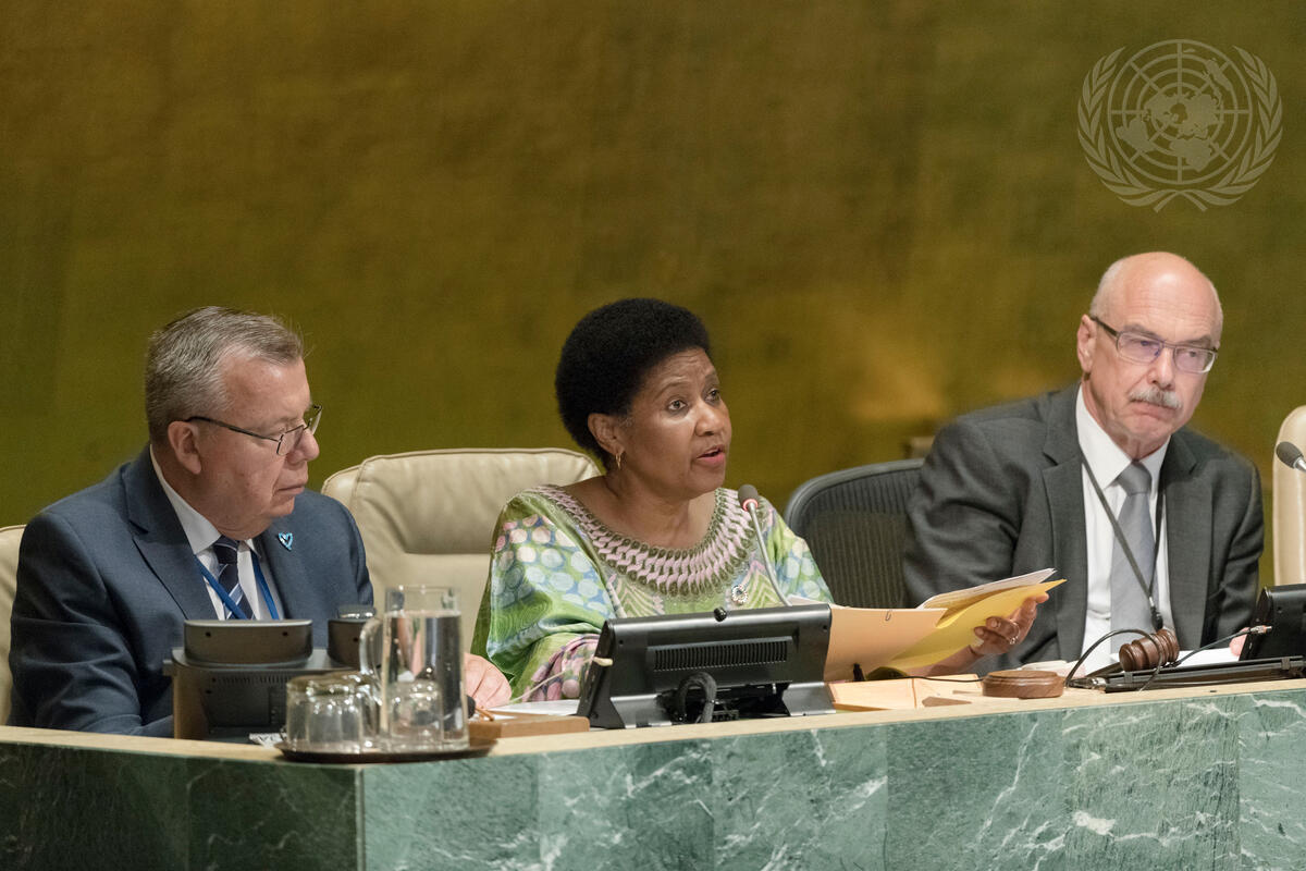 Phumzile Mlambo-Ngcuka (centre), Executive Director of the UN Entity for Gender Equality and the Empowerment of Women (UN Women), addresses the High-level Conference of Counter-Terrorism. She is flanked by Yury Fedotov (left), Executive Director of the United Nations Office on Drugs and Crime, and Vladimir Voronkov, Under-Secretary-General of the United Nations Office of Counter-Terrorism.