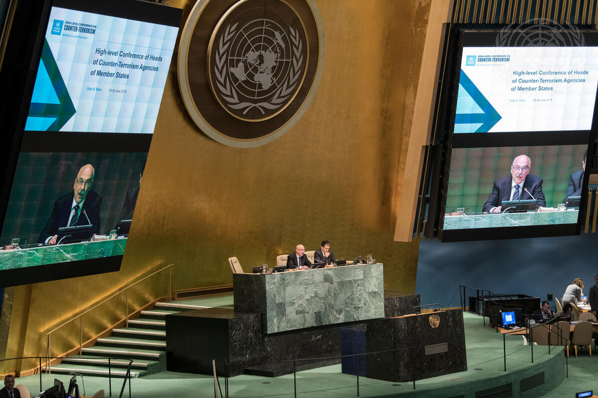 Vladimir Voronkov (left at dais and on screens), Under-Secretary-General of the United Nations Office of Counter-Terrorism, addresses the opening of the High-level Conference on Counter-Terrorism. On the right at dais is Movses Abelian, Assistant Secretary-General for General Assembly and Conference Management.