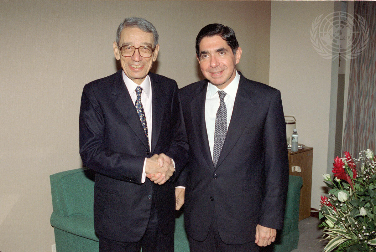 Boutros Boutros-Ghali, Secretary-General of the United Nations, attends the signing of the final peace agreement between the Government of Guatemala and the United Nations URNG, 29 December 1996, in Guatemala. Photo shows the Secretary-General with Oscar Arias-Sanchez, a former President of Costa Rica.