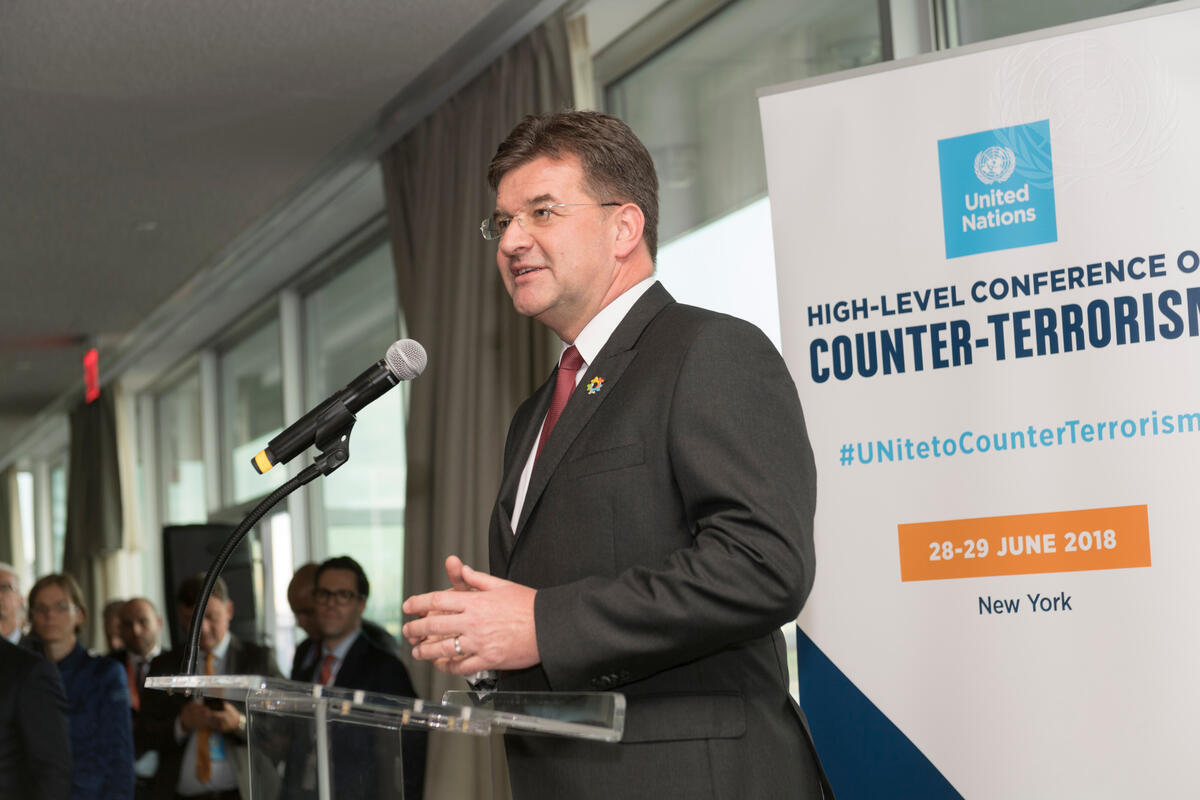 Miroslav Lajcák, President of the seventy-second session of the General Assembly, addresses a reception in the Delegates Dining Room hosted by Vladimir Voronkov, Under-Secretary-General of the United Nations Office of Counter-Terrorism, on the side of the High-level Conference of Counter-Terrorism.