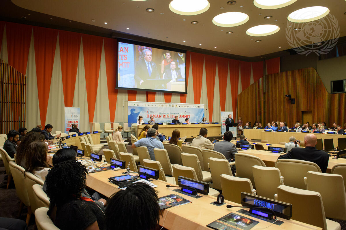 Luis Almagro Lemes (on screen and at podium), Secretary General of the Organization of American States (OAS), addresses the 15th Annual International Human Rights Summit 2018, which focused on Youth for Human Rights.
