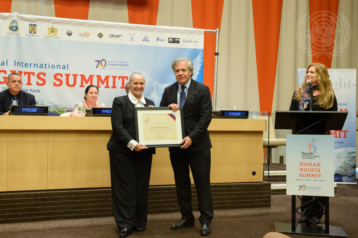 Luis Almagro Lemes (centre left), Secretary General of the Organization of American States (OAS), receives a plaque from Mary Shuttleworth, President of Youth for Human Rights International, at the 15th Annual International Human Rights Summit 2018, which focused on Youth for Human Rights.