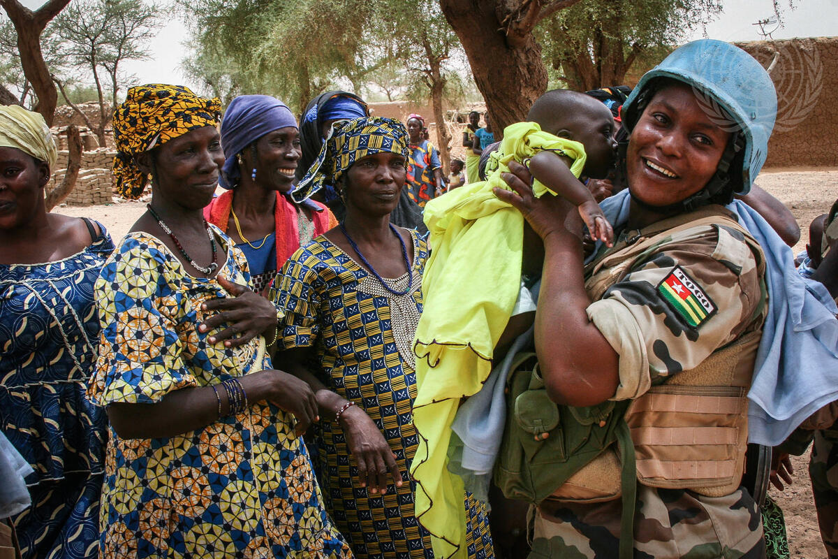 A peacekeeper from Togo serving with the United Nations Multidimensional Integrated Stabilization Mission in Mali (MINUSMA) holds a child while on a mission to provide medical care to residents of a village in the Mopti region.