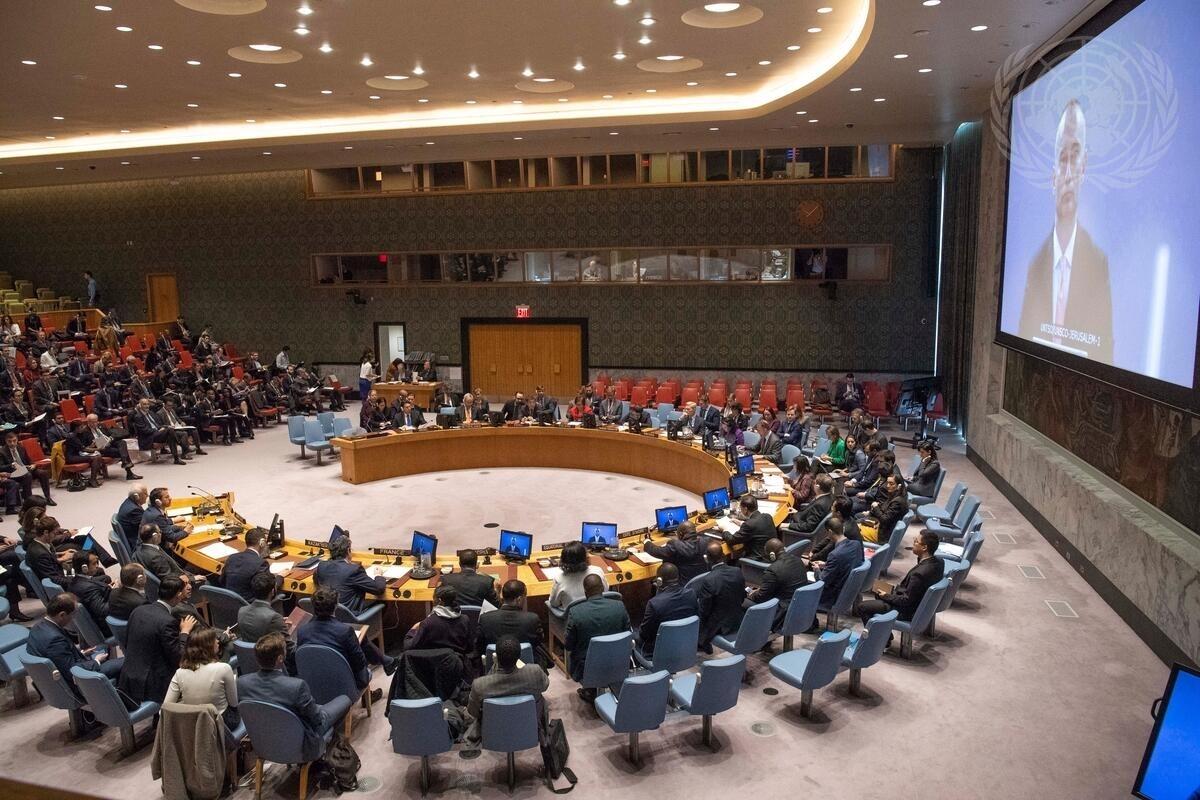 A wide view of the Security Council meeting as Nickolay Mladenov (on screens), UN Special Coordinator for the Middle East Peace Process and Personal Representative of the Secretary-General to the Palestine Liberation Organization and the Palestinian Authority, briefs the Council on the situation in the Middle East, including the Palestinian question.