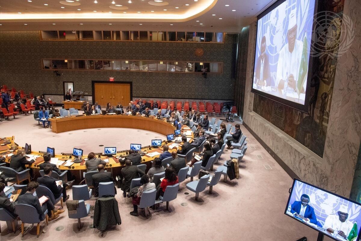 A wide view of the Security Council chamber as Parfait Onanga-Anyanga (left on screen), Special Representative of the Secretary-General and Head of the UN Multidimensional Integrated Stabilization Mission in the Central African Republic (MINUSCA), and Bédializoun Moussa Nebié (right on screen), Special Representative of the African Union to the Central African Republic, brief the Council on the situation in the that country.