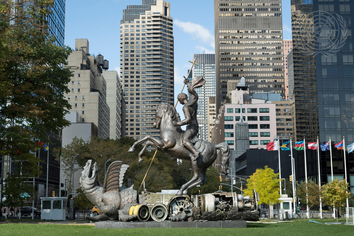 A view of the sculpture titled ""Good Defeats Evil"", created by Zurab Tsereteli, a native of Georgia, and presented to the UN on the occasion of the Organization's 45th anniversary by the Soviet Union.
