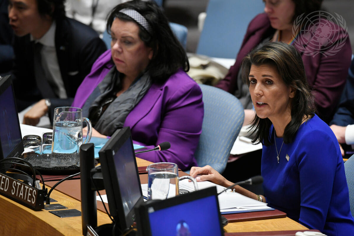 Nikki R. Haley, Permanent Representative of the United States to the UN, addresses the Security Council meeting on the situation in the Middle East, including the Palestinian question. At left is Karen Pierce, Permanent Representative of the United Kingdom to the UN.