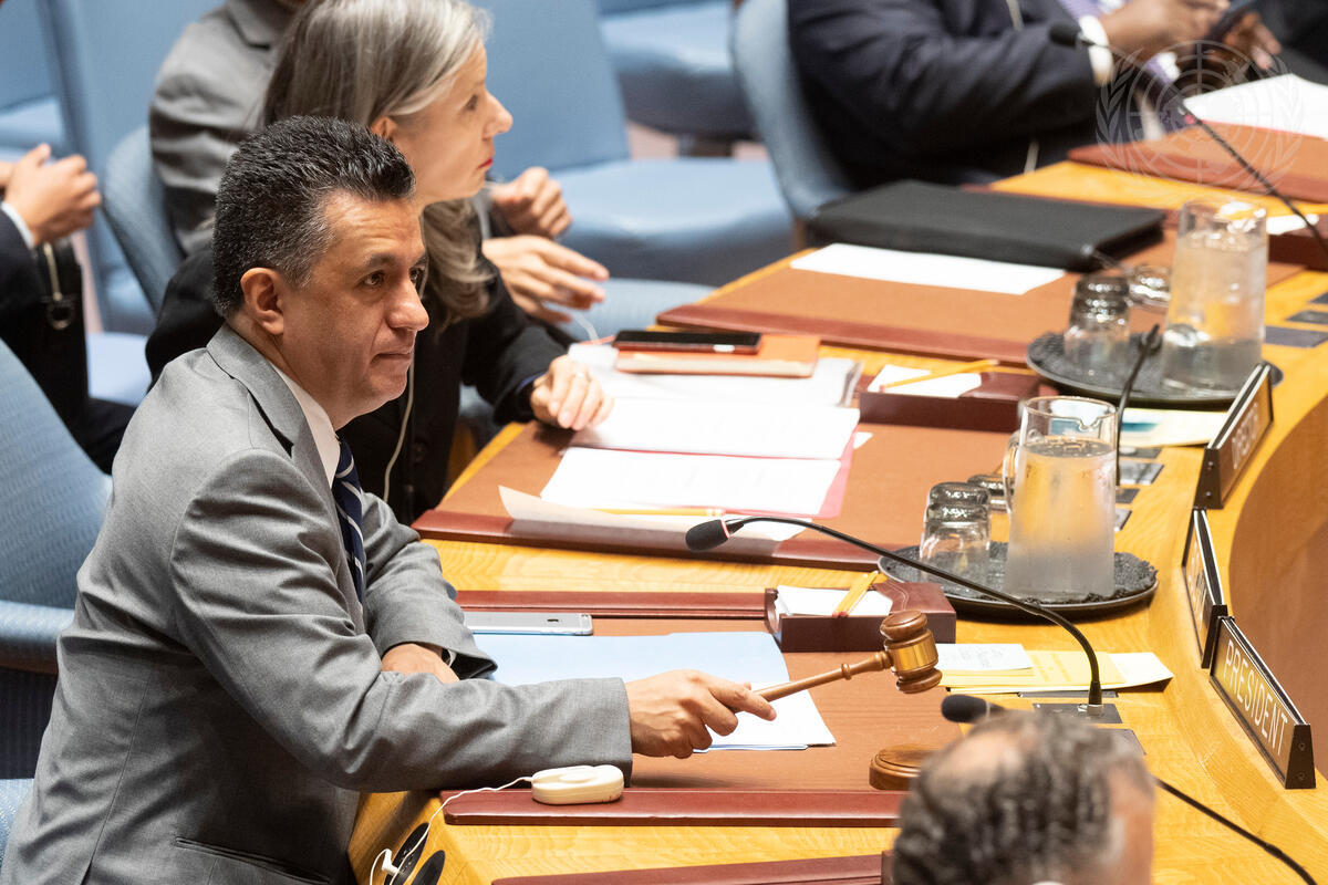 Sacha Sergio Llorentty Solíz, Permanent Representative of Bolivia to the UN and President of the Security Council for the month of October, chairs the Security Council meeting on the situation in Syria.