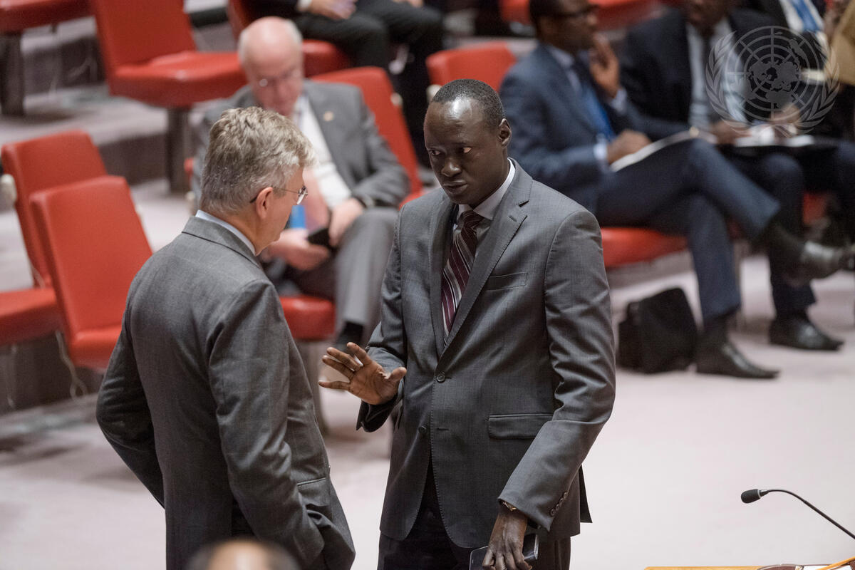 Issa Konfourou (right), Permanent Representative of the Republic of Mali to the UN, speaks with Jean-Pierre Lacroix, Under-Secretary-General for Peacekeeping Operations, prior to the Security Council meeting on the situation in Mali.