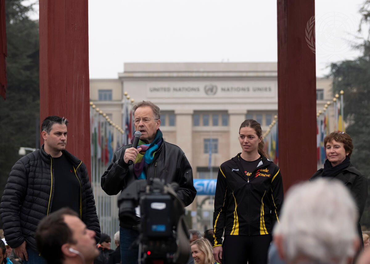 Michael Møller (second from left), Director General of the United Nations Office in Geneva (UNOG), speaks at the training session for the Escalade Race at Palais des Nations, in Geneva. Also pictured (left to right): Jerry Maspoli, President of the Escalade Race; Celine van Till, elite sportswoman and speaker for people with disabilities; and Michèle Boccoz, Assistant Director-General for External Relations of the World Health Organization. The Escalade Race is to be held in Geneva in December.