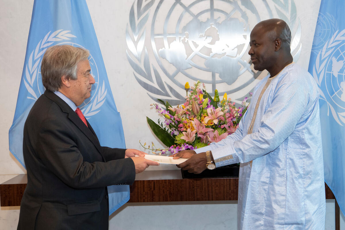 Lang Yabou (right), new Permanent Representative of the Gambia to the United Nations, presents his credentials to Secretary-General António Guterres.