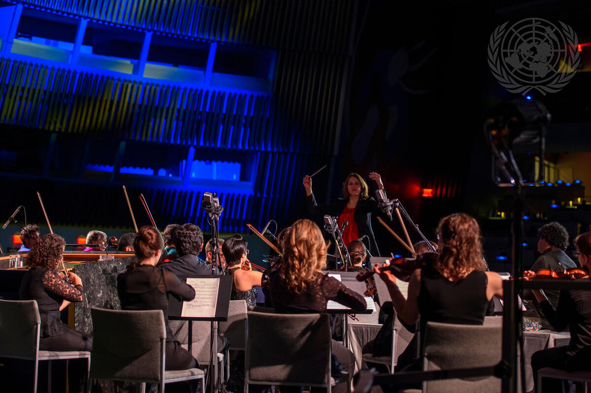 Lidiya Yanskovskaya, conducts the Refugee Orchestra during the 2018 UN Day Concert, the theme of which was ""Traditions of Peace and Non-violence"". The concert featured music by Sarod Maestro Amjad Ali Khan and the Refugee Orchestra Project.