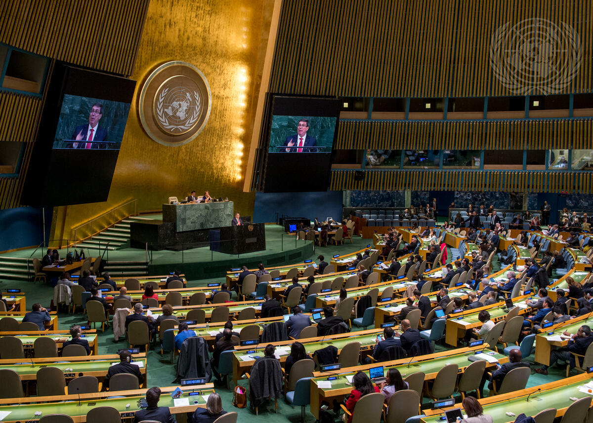 A view of the General Assembly Hall as Bruno Eduardo Rodríguez Parrilla (shown on screens), Minister for Foreign Affairs of Cuba, addresses the Assembly’s meeting on the necessity of ending the economic, commercial and financial embargo imposed by the United States against his country.