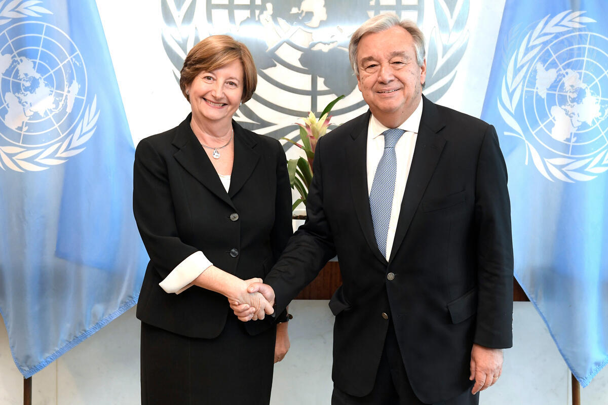 Secretary-General António Guterres (right) meets with Silvia Fernández de Gurmendi, President of the International Criminal Court (ICC).