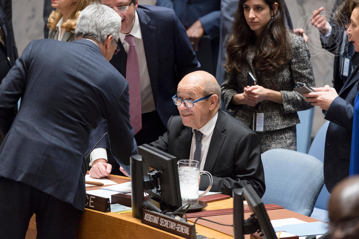 Jean-Yves Le Drian (centre), Minister for Foreign Affairs of France and President of the Security Council for October, greets a delegate at the Council’s meeting on the Joint Force of the Group of Five for the Sahel.