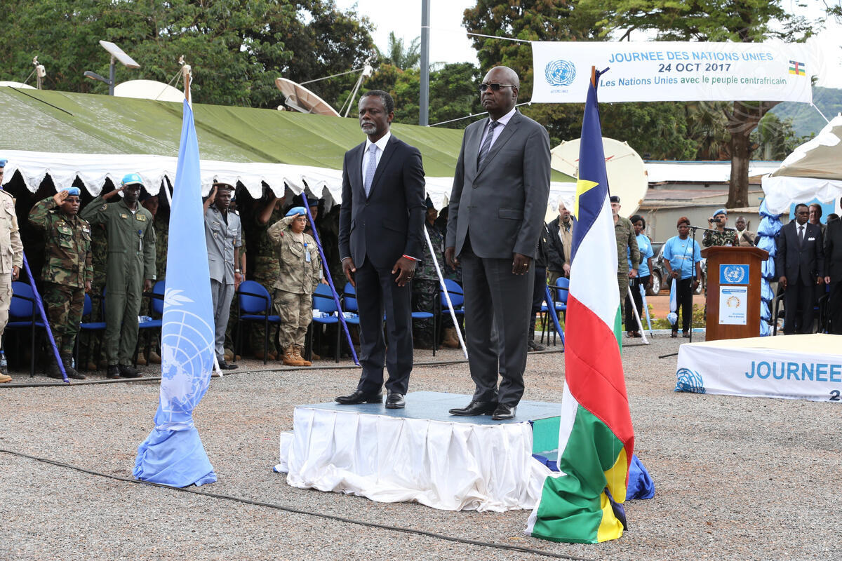 Parfait Onanga-Anyanga (centre left), Special Representative of the Secretary-General and Head of the UN Multidimensional Integrated Stabilization Mission in the Central African Republic (MINUSCA), and Simplice Mathieu Sarandji, Prime Minister of the Central African Republic, participate in a ceremony in Bangui marking UN Day.