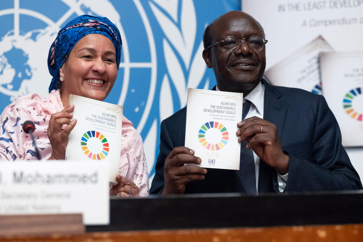 Deputy Secretary-General Amina Mohammed (left) and Mukhisa Kituyi (right), Secretary-General of the United Nations Conference on Trade and Development (UNCTAD), during the launch of the publication ""Achieving the Sustainable Development Goals in the Least Developed Countries"".