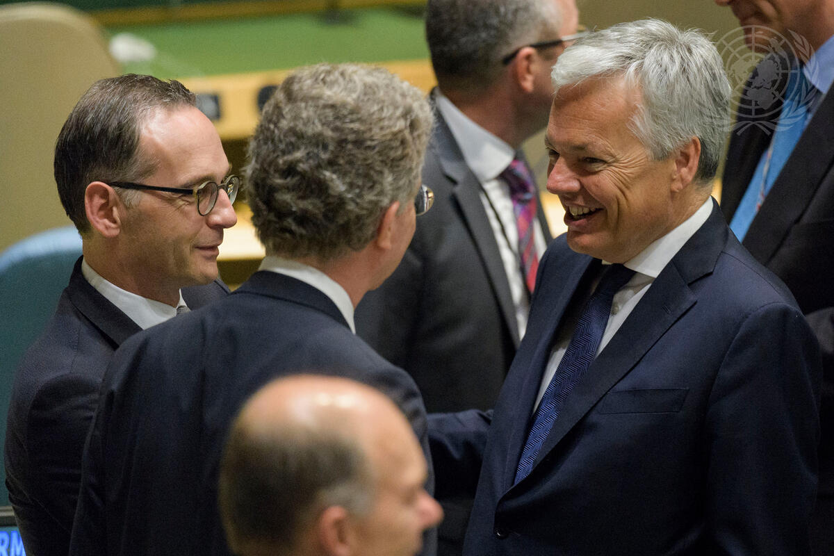 Didier Reynders (right), Deputy Prime Minister and Minister for Foreign Affairs of Belgium, speaks with Heiko Mass (left), Minister for Foreign Affairs of the Federal Republic of Germany, and Christoph Heusgen (centre), Permanent Representative of Germany to the UN, in the General Assembly Hall before the election.
