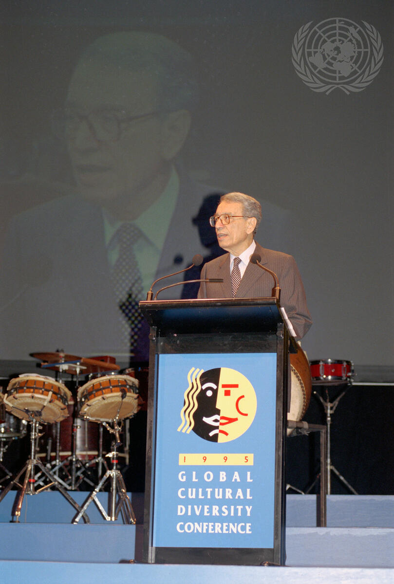 Boutros Boutros-Ghali, Secretary-General of the United Nations, addressing the Global Cultural Diversity Conference, in Darling Habour, during his visit to Australia.