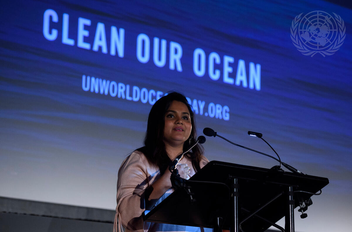 Jayathma Wickramanayake, Secretary-General’s Envoy on Youth, makes remarks during an event held on the occasion of World Oceans Day. The event included a panel discussion highlighting the important roles of youth and innovation in addressing solutions towards cleaning our oceans.