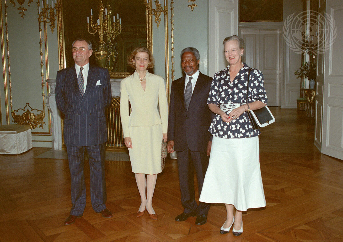 Kofi Annan, Secretary-General of the United Nations (second from right), and Nane Annan (second from left), at a luncheon hosted by Queen Margrethe II (right), and Prince Henrik of Denmark, at Amalienborg Palace.