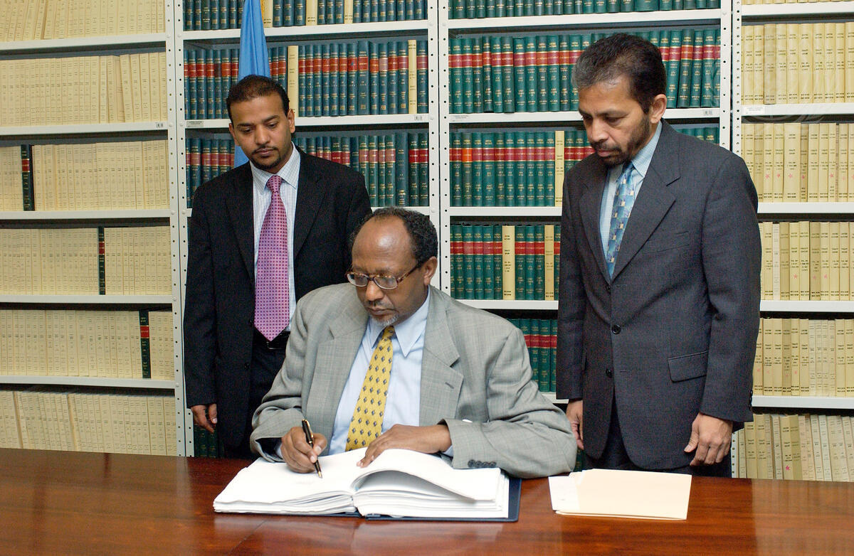 Ambassador Roble Olhaye (seated), Permanent Representative of Djibouti, signs the World Health Organization Framework Convention on Tobacco Control.