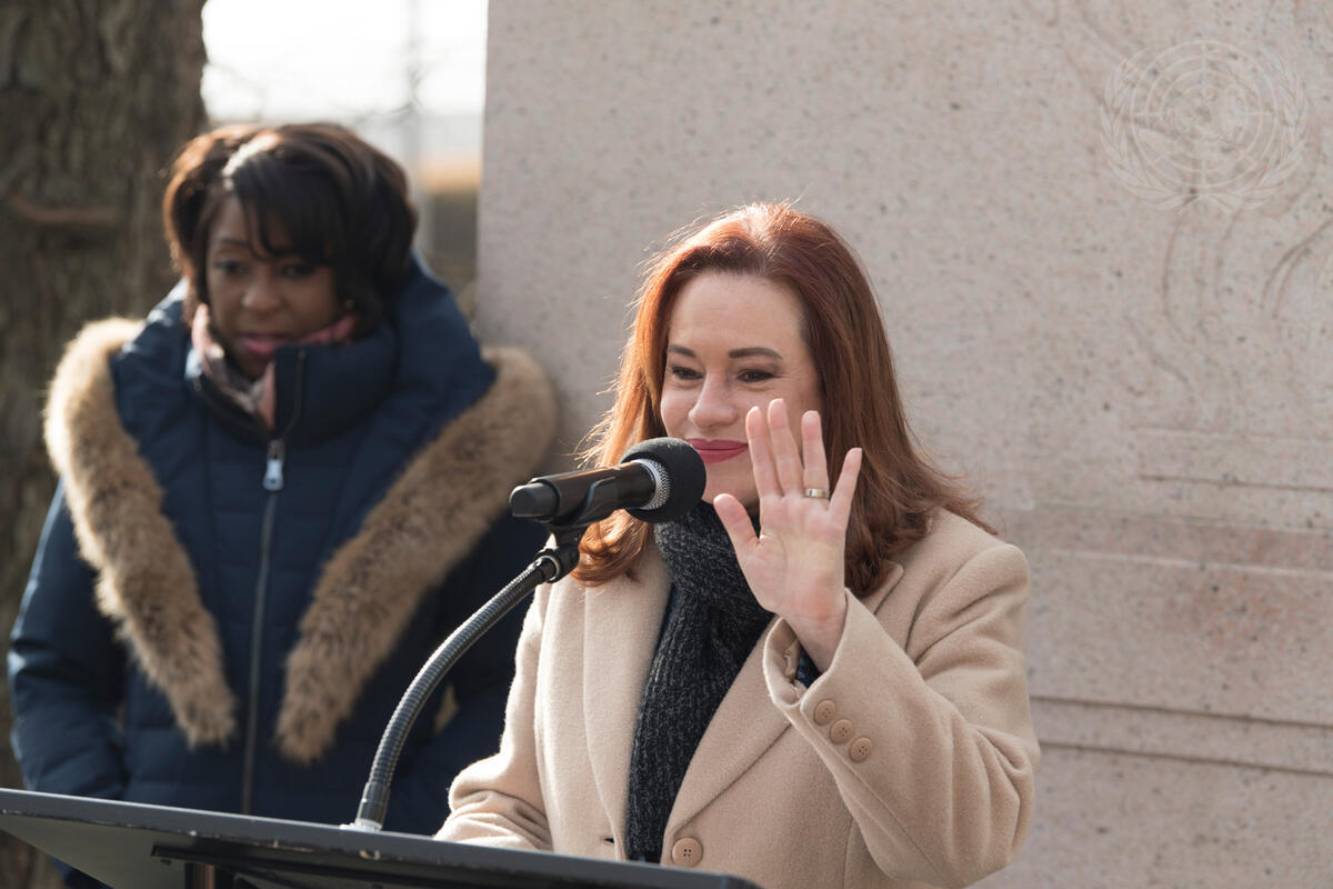 María Fernanda Espinosa, President of the seventy-third session of the General Assembly, participates in a special event recreating the archival photo of children holding the Universal Declaration of Human Rights, to commemorate the 70th anniversary of the declaration.