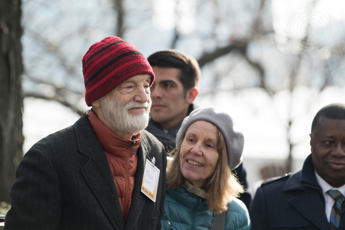 Franklin Delano Roosevelt III, grandson of President Franklin D. Roosevelt and Eleanor Roosevelt, and his wife Grace Roosevelt, participate in a special event recreating the archival photo of children holding the Universal Declaration of Human Rights, to commemorate the 70th anniversary of the declaration.