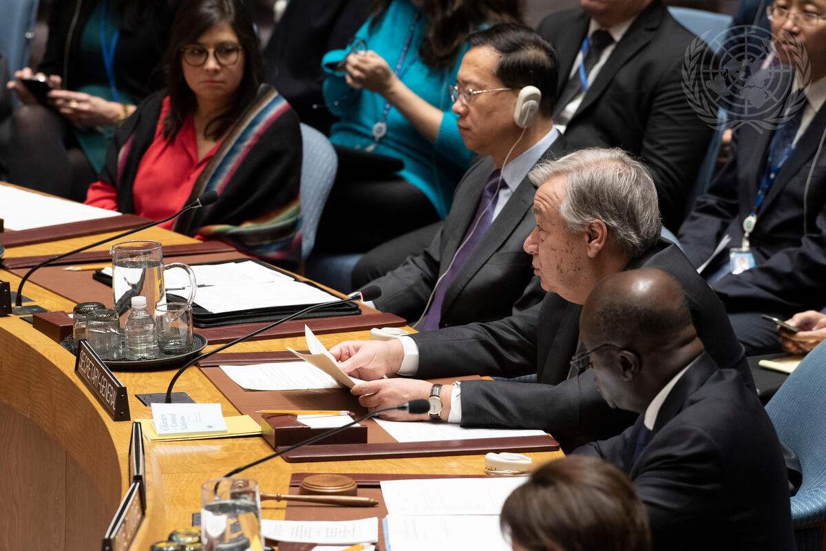 Secretary-General António Guterres (centre) briefs the Security Council on cooperation between the United Nations and regional and subregional organizations in maintaining international peace and security, with a focus on the role of States, regional arrangements and the United Nations in the prevention and resolution of conflicts.