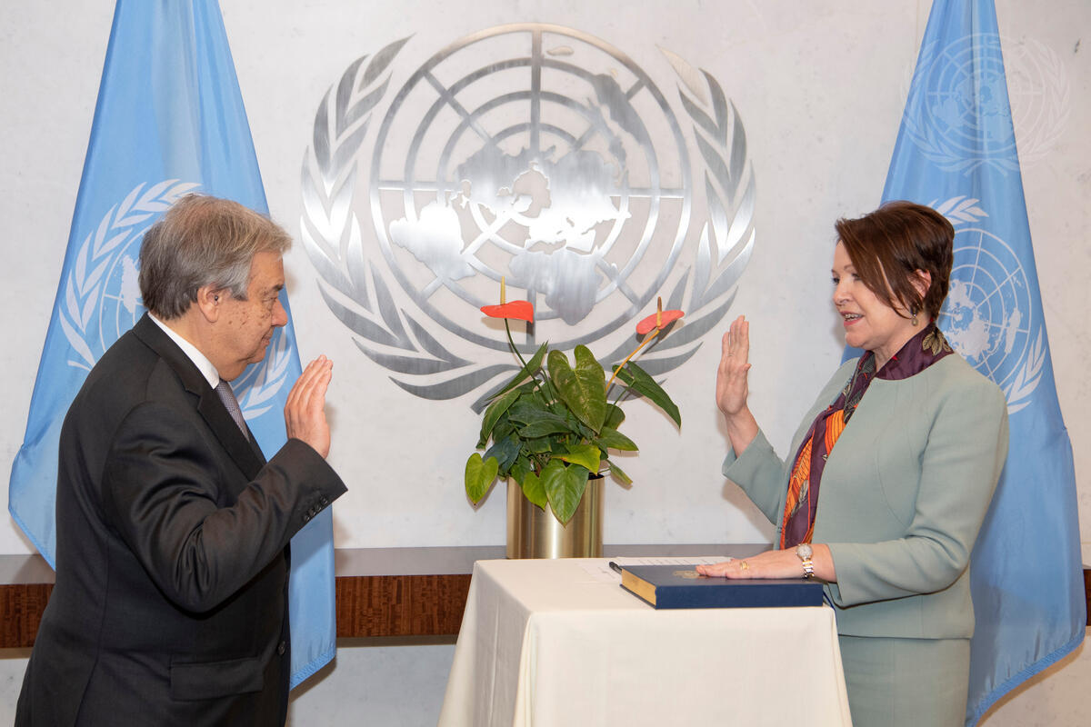 Secretary-General António Guterres (left) swears in Nóirín O’Sullivan, Assistant Secretary-General for Safety and Security.