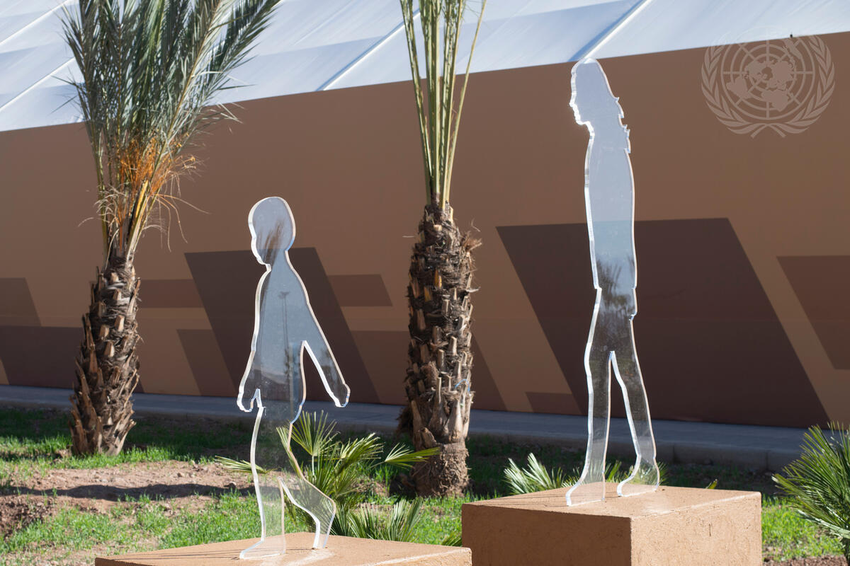 A view of the artwork depicting migrants at the venue of the Intergovernmental Conference to adopt the Global Compact for Safe, Orderly and Regular Migration, convened on 10 and 11 December in Marrakech, Morocco, under the auspices of the United Nations General Assembly.