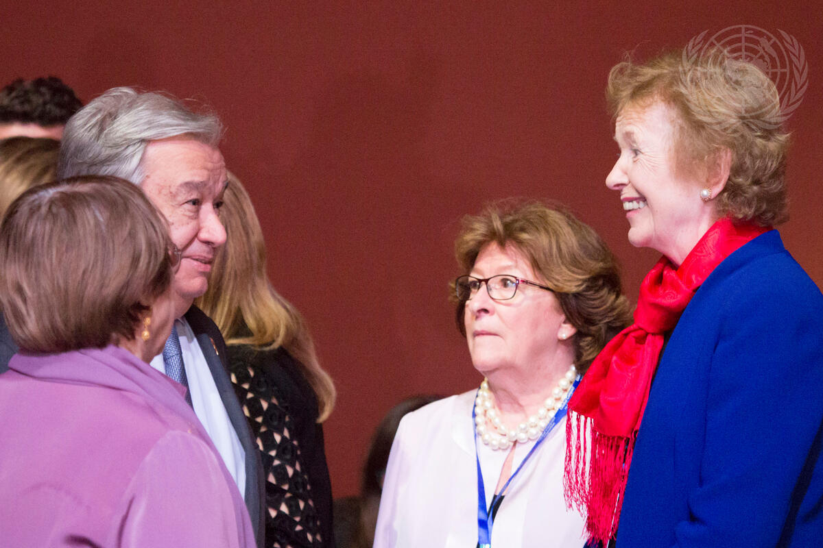 Secretary-General António Guterres (second from left) speaks with Mary Robinson (right), chair of The Elders and President of the Mary Robinson Foundation, Louise Arbour (second from right), Special Representative of the Secretary-General for International Migration, and Michelle Bachelet (left), United Nations High Commissioner for Human Rights, during the high-level event to celebrate the 70th anniversary of the Universal Declaration of Human Rights.