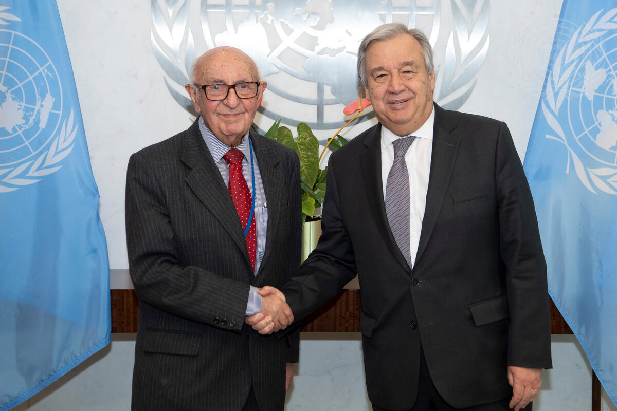 Secretary-General António Guterres (right) meets with Judge Theodor Meron, President of the Mechanism for International Criminal Tribunals.
