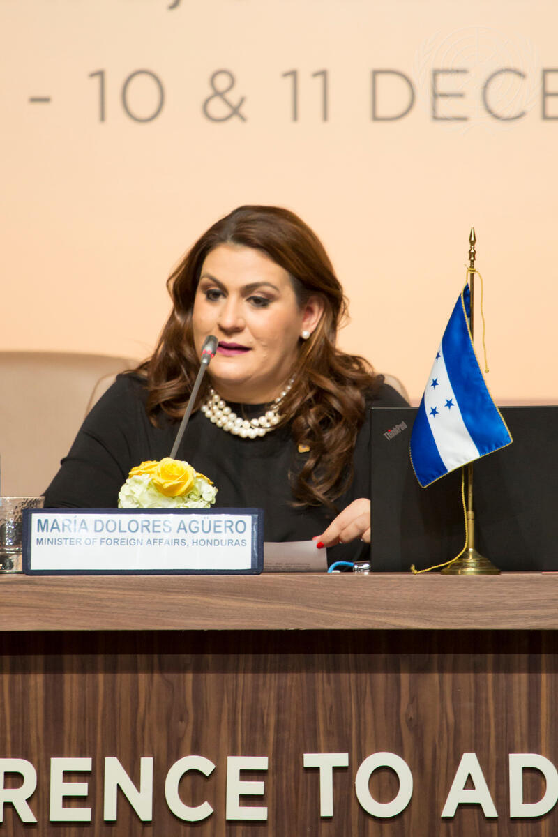 María Dolores Agüero, Minister of Foreign Affairs of Honduras, speaks at the press conference on ""Migration and sustainable development in Northern Central America and Mexico: a regional strategy to implement the Global Compact"" during the Intergovernmental Conference to Adopt the Global Compact for Safe, Orderly and Regular Migration. The Conference, taking place in Marrakech, Morocco, 10-11 December, was convened under the auspices of the United Nations General Assembly.
