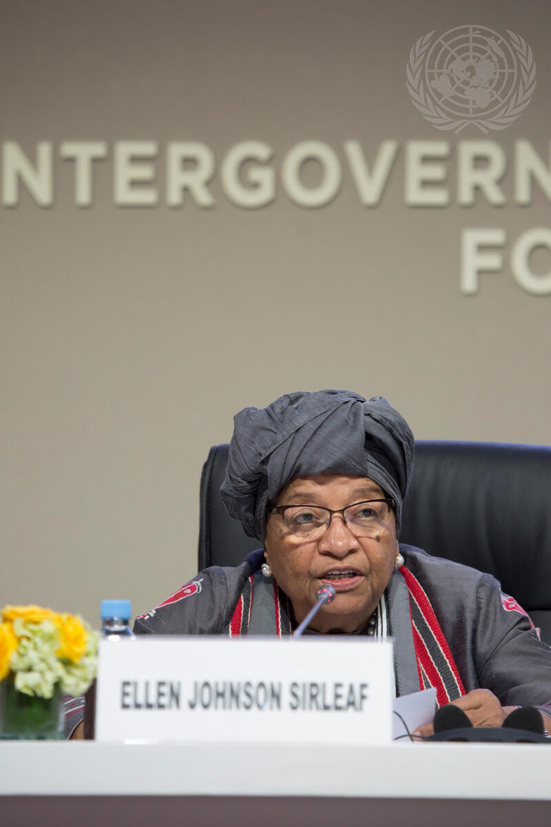 Ellen Johnson Sirleaf, chair of the High-Level Panel on International Migration in Africa, makes keynote remarks at the dialogue on ""Partnerships and innovative initiatives for the way forward"".