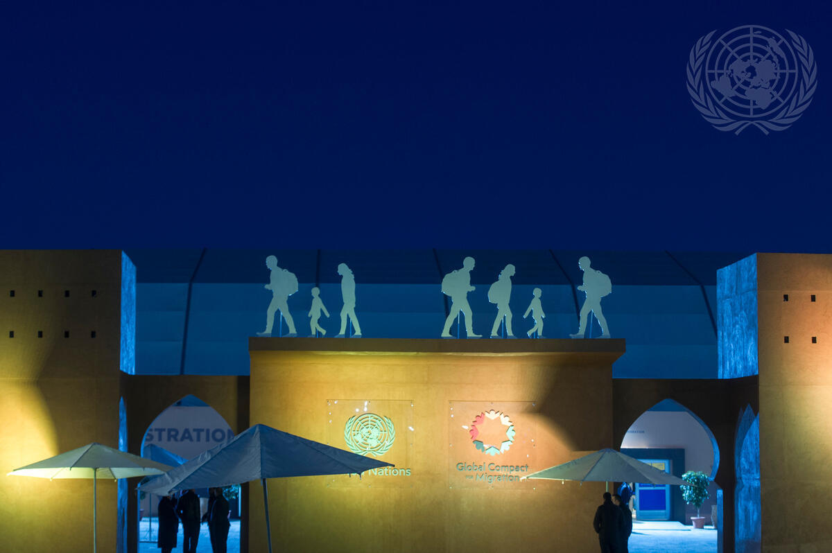 A view of the artwork depicting migrants at the main entrance of the venue of the Intergovernmental Conference to adopt the Global Compact for Safe, Orderly and Regular Migration, convened on 10 and 11 December in Marrakech, Morocco, under the auspices of the United Nations General Assembly. On 10 December a high-level event to celebrate the 70th anniversary of the Universal Declaration of Human Rights was held at the venue.