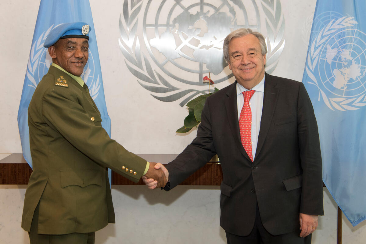 Secretary-General António Guterres (right) meets with Major-General Gebre Adhana Woldezgu, incoming Force Commander and Acting Head of Mission for the United Nations Interim Security Force for Abyei (UNISFA).