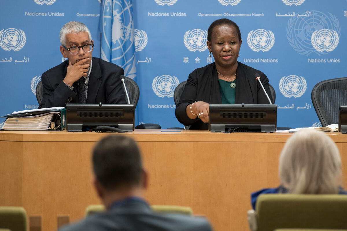 Bintou Keita (right), Assistant Secretary-General for Peacekeeping Operations, brief journalists on her recent visit to South Sudan and Ethiopia as guest at the noon briefing. At left is Farhan Haq, Deputy Spokesperson for the Secretary-General.
