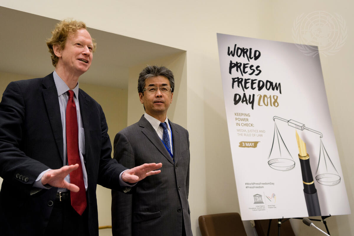 Jan Kickert (left), Permanent Representative of Austria to the UN and Chair of the Committee on Information (COI) and Hajime Kishimori, Counsellor of the Permanent Mission of Japan to the UN and Rapporteur of COI, prior to the special event entitled ""Keeping Power in Check: The Protection of Journalists and Media Workers"", on the occasion of the 25th Anniversary of World Press Freedom Day.