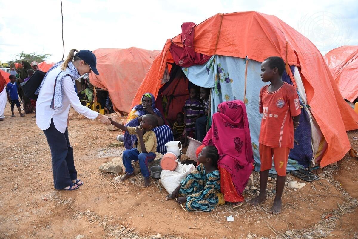 Yngvil Foss, the Deputy Head of the United Nations Office for the Coordination of Humanitarian Affairs, interacts with a family of flood victims on the outskirts of Belet Weyne. The city is currently experiencing its worst flooding ever with over 150,000 people displaced.