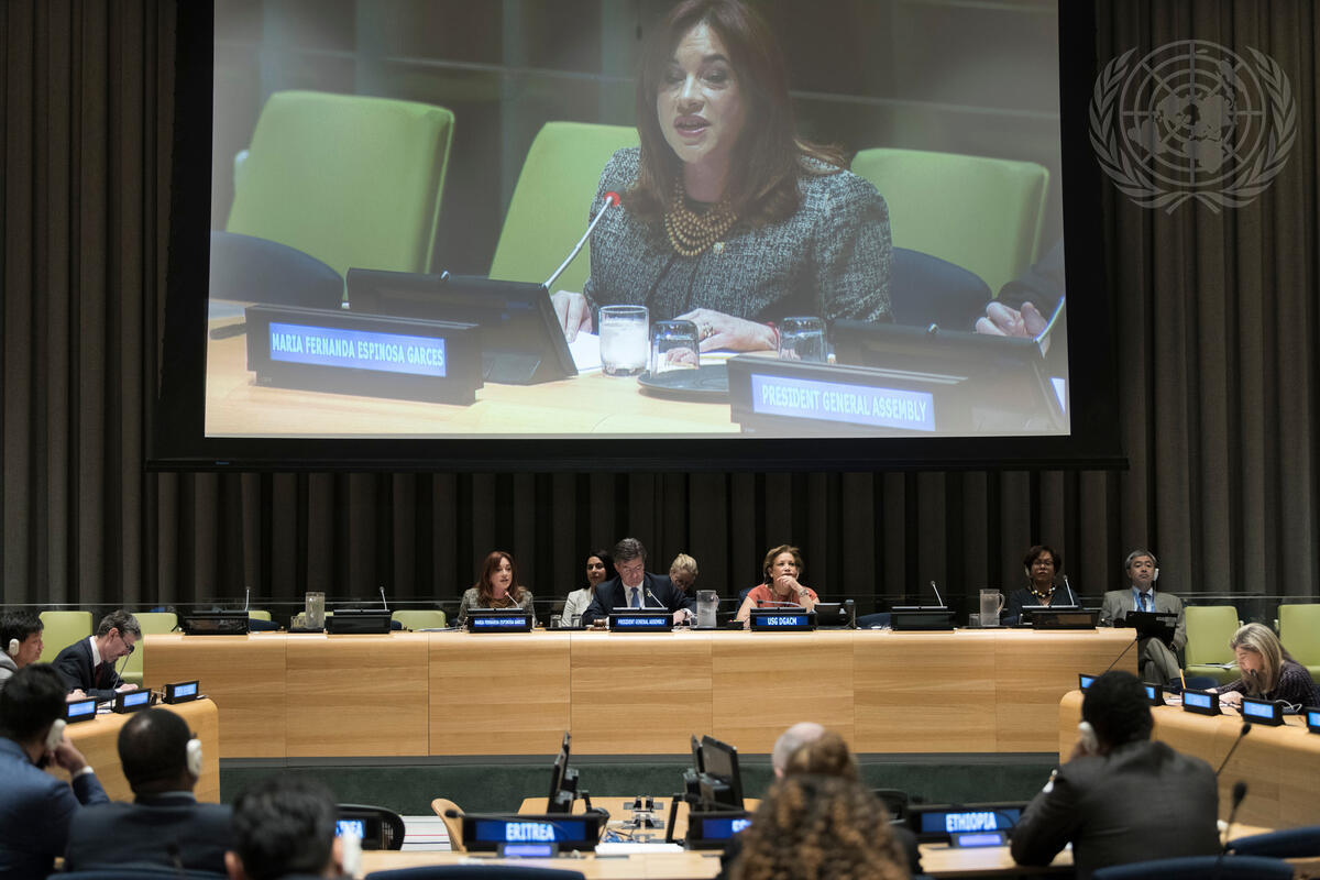 Maria Fernanda Espinosa Garces (left and on screen), Minister of Foreign Affairs and Human Mobility of Ecuador, addresses the informal interactive dialogue with candidates for the position of President of the General Assembly for the seventy-third session. To her left is Miroslav Lajcák, President of the seventy-second session of the General Assembly, and Catherine Pollard, Under-Secretary-General for General Assembly Affairs and Conference Management.