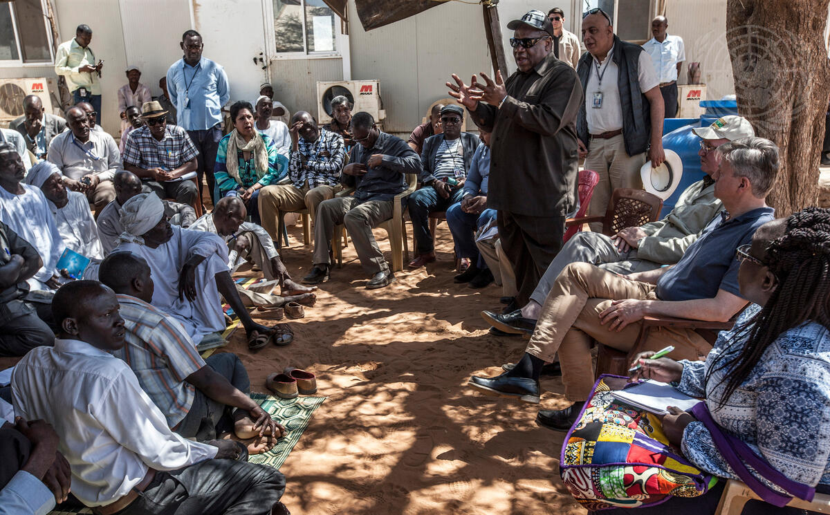 Jeremiah Nyamane Kingsley Mamabolo, Joint Special Representative for Darfur and Head of the African Union-United Nations Hybrid Operation in Darfur (UNAMID), addresses community leaders at the camp.