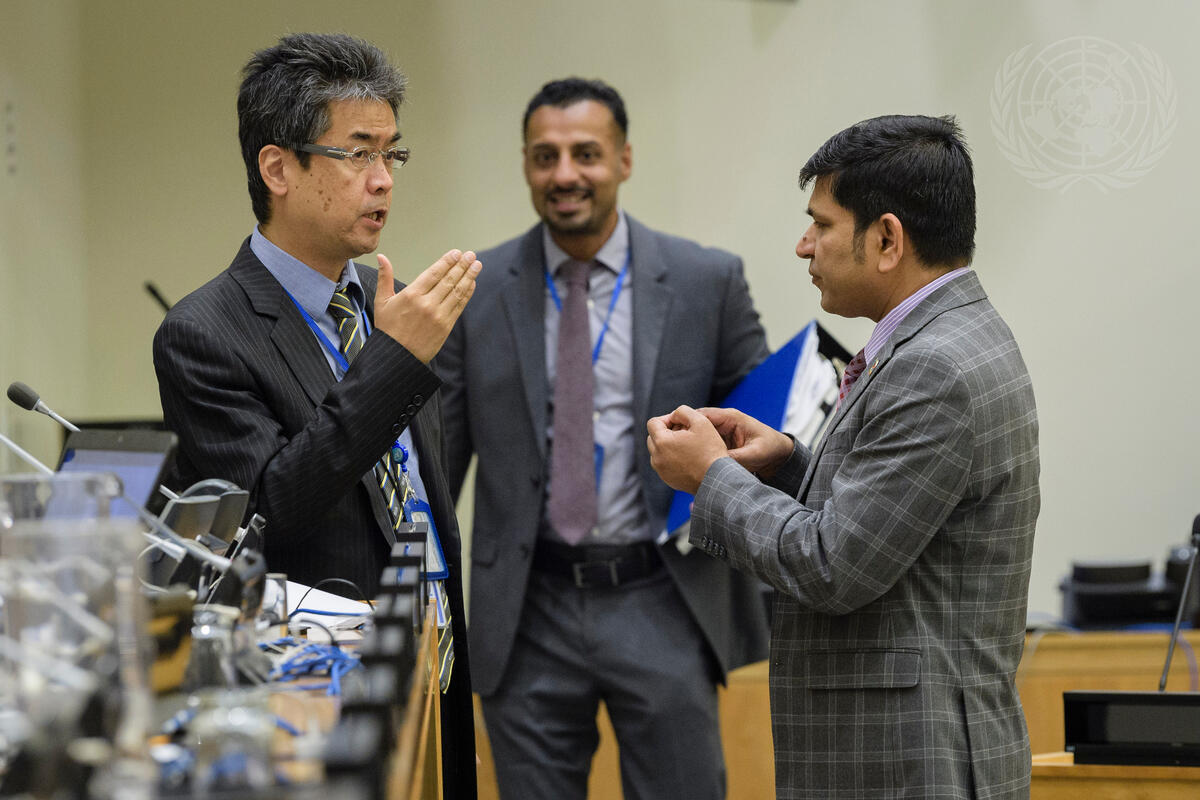 Hajime Kishimori, Counsellor of the Permanent Mission of Japan to the UN and Rapporteur of of the Committee on Information (COI), speaks with another COI participant after the third meeting of the COI.