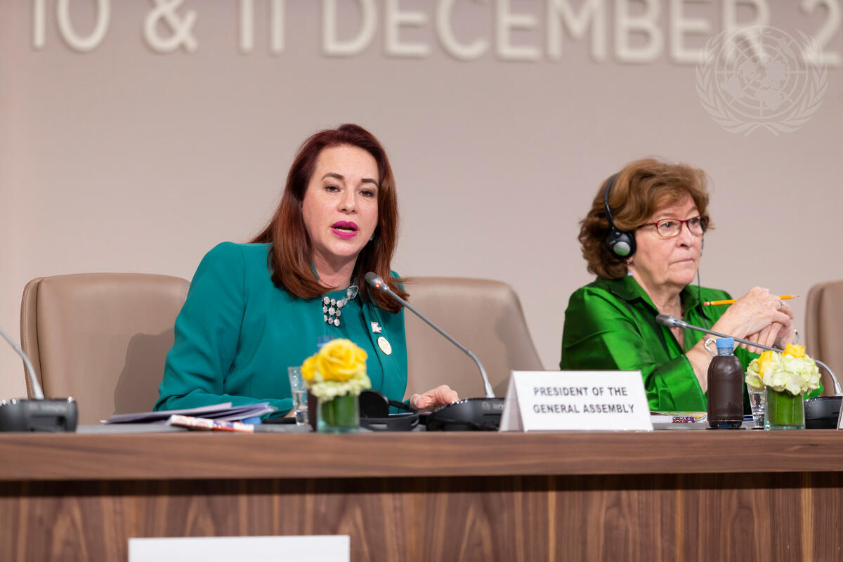 María Fernanda Espinosa Garcés (left), President of the seventy-third session of the General Assembly, addresses the closing session of the Intergovernmental Conference on the Global Compact for Migration. At right is Louise Arbour, Special Representative of the Secretary-General for International Migration.
