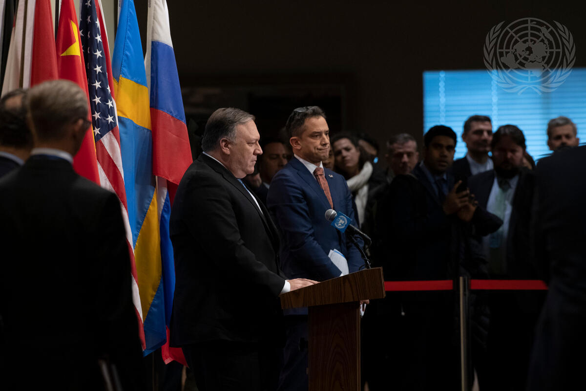 Michael R. Pompeo, Secretary of State of the United States of America, briefs press on Iran and Resolution 2231 (2015) after the Security Council meeting on non-proliferation.