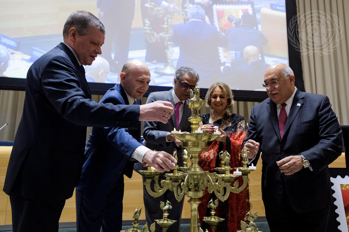 A traditional diya lamp lighting ceremony is held during the presentation of ""The Power of One"" award to commemorate the issuance of the Diwali Stamp by the United States Postal Service. The award, established by Diwali Foundation USA, Inc. in 2017, aims to celebrate and highlight the important role of diplomats and international officials in promoting peace on Earth.