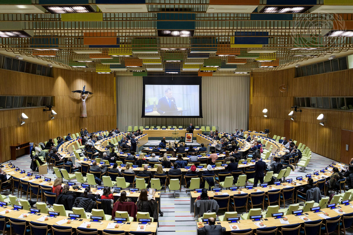 A wide view of the ceremony presenting ""The Power of One"" awards to commemorate the issuance of the Diwali Stamp by the United States Postal Service, as Valentin Rybakov (on screen), Permanent Representative of the Republic of Belarus to the United Nations, makes remarks.