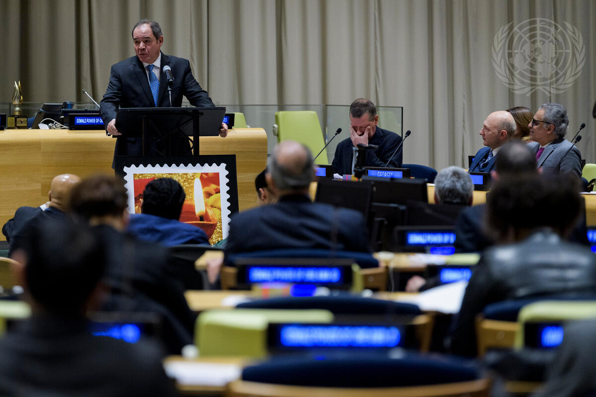 Sabri Boukadoum, Permanent Representative of Algeria, addresses the ceremony presenting ""The Power of One"" awards to commemorate the issuance of the Diwali Stamp by the United States Postal Service.