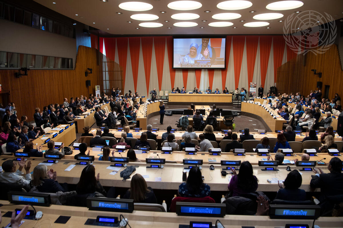 A wide view of the ECOSOC chamber as Phumzile Mlambo Ngcuka (on screen), Executive Director of the United Nations Entity for Gender Equality and the Empowerment of Women (UN Women), speaks at the United Nations Observance of International Women’s Day on the theme ""Think Equal, Build Smart, Innovate for Change"".