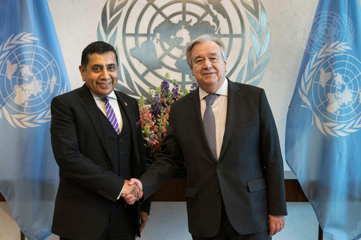 Secretary-General António Guterres (right) meets with Tariq Mahmood Ahmad of Wimbledon, Minister of State for the Commonwealth and the United Nations of the United Kingdom of Great Britain and Northern Ireland.